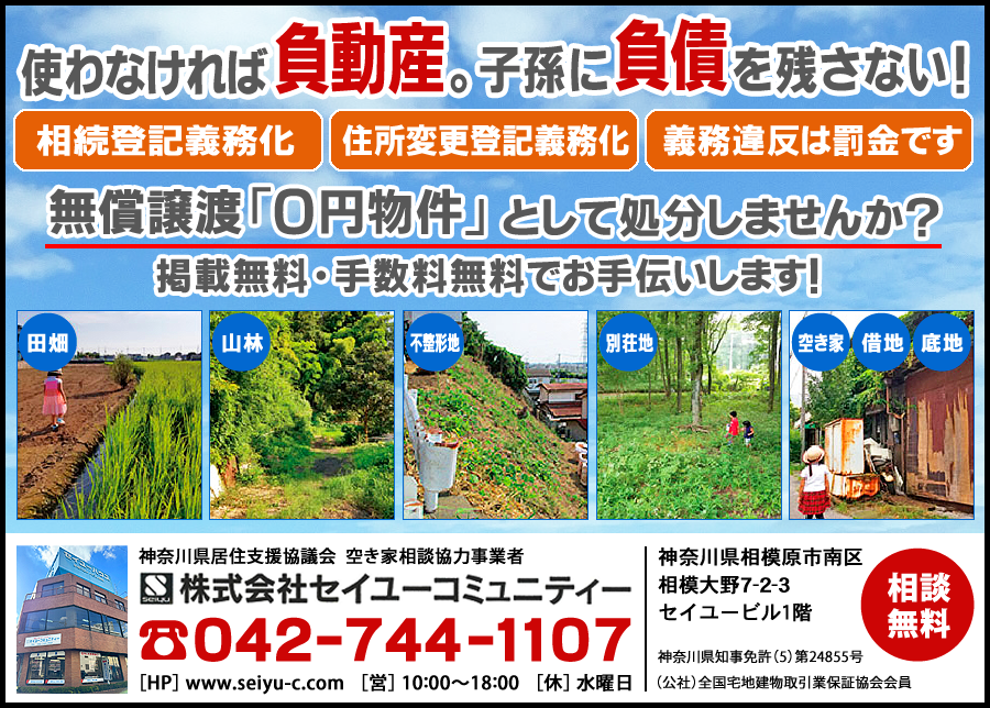 神奈川県居住支援協議会空き家相談事業者市街化調整区域・農地・田・畑・山林の有効利用は《セイユーコミュニティー》へ